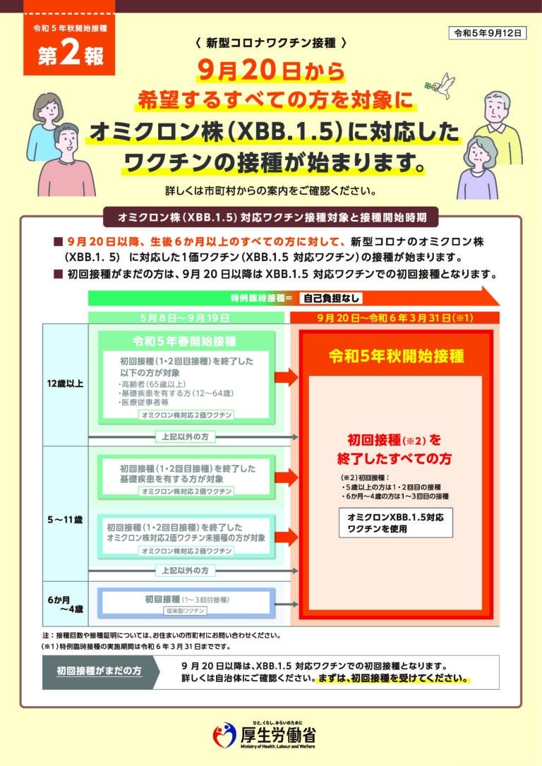 9月20日から希望するすべての方を対象にオミクロン株(XBB.1.5)に対応したワクチンの接種が始まります。接種券をお持ちのすべての方が対象となります。ご予約はお電話でのみ承っております。